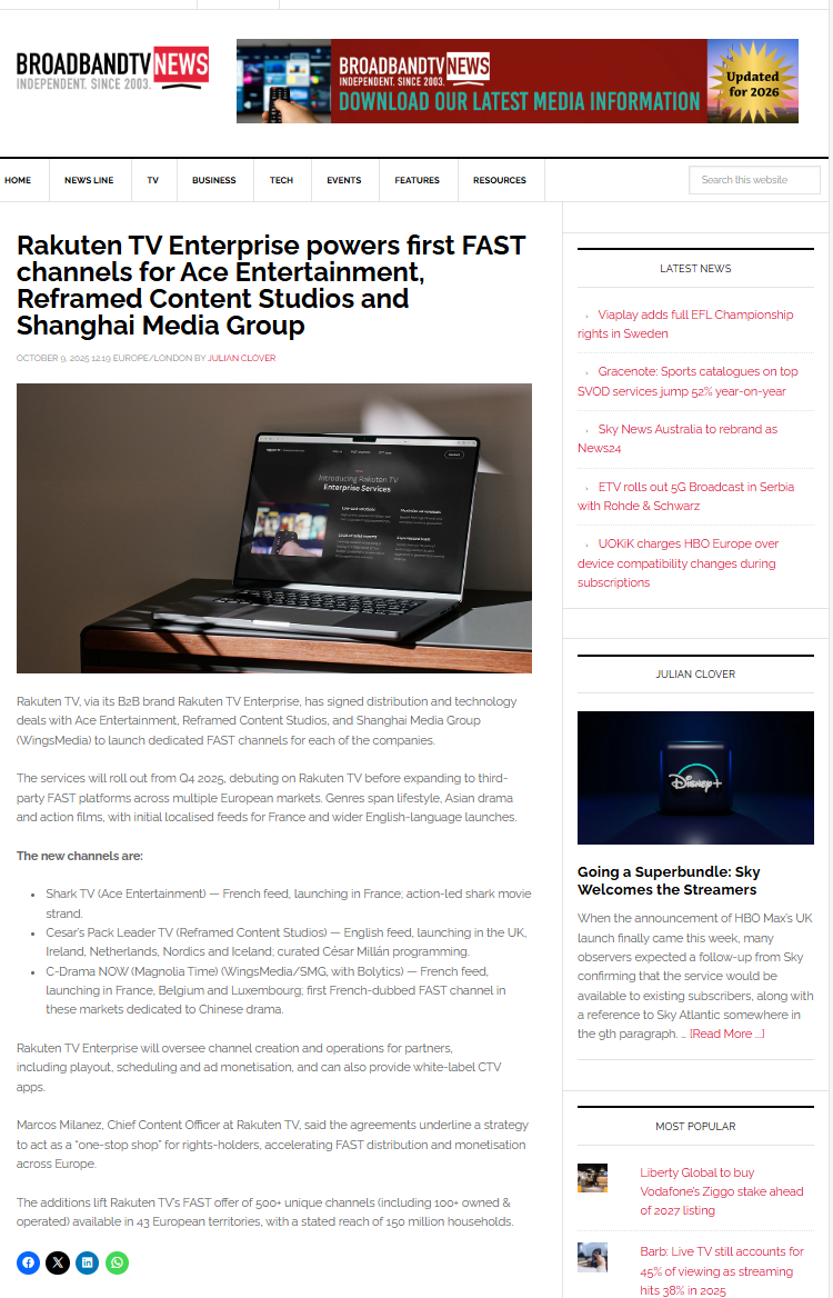 作为首个在法国主流平台常态化运营的亚洲内容FAST频道,法国白玉兰FAST频道不仅是中国内容走向欧洲的视听窗口,更是连接中法文化的重要桥梁。频道采用国际主流的免费广告支持流媒体电视(FAST)模式,通过 “内容授权+技术托管+广告分账+本地运营”的创新合作机制,对接Rakuten TV成熟的基础设施,实现了内容管理、播出编排、广告插入和数据反馈的完整运营闭环,为中国视听内容在海外市场的价值转化与长期发展探索了一套可持续发展模式。