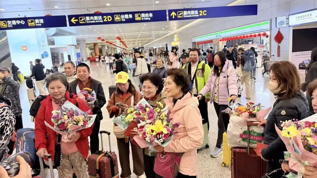 北京时间3月9日凌晨0:19和0:54,两架载有东方购物旅行团游客的航班先后平稳降落在上海浦东国际机场。当游客们推着行李走出到达口时,等候多时的东方购物工作人员迎上前去,为他们献上鲜花,一句暖心的“欢迎回家”,让旅途的疲惫化作归家的安心。